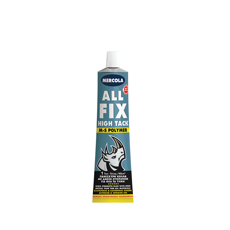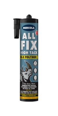 Το ALL FIX HIGH TACK είναι πανίσχυρη συγκολλητική και σφραγιστική μαστίχη ενός συστατικού, νέας τεχνολογίας. Βασίζεται σε υβριδικές ρητίνες τροποποιημένου σιλανίου, τεχνολογίας HYBRID – SMP (Hybrid Silyl Modified Polymer) ενώ δεν περιέχει διαλύτες και ισοκυανικές ενώσεις. Παρουσιάζει πολύ υψηλή δύναμη συγκόλλησης με άμεση συγκράτηση κατά την τοποθέτηση χωρίς να απαιτεί κανενός είδους προσωρινής στήριξης. Αντικαθιστά βίδες και καρφιά. Στεγνώνει όταν έρθει σε επαφή με υγρασία. Το υλικό στη φύσιγγα μπορεί να επαναχρησιμοποιηθεί έως και τρεις μήνες μετά την πρώτη χρήση εφόσον σφραγισθεί καλά.